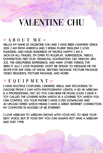 Olá! Meu nome é Valentine Chu e participo de cams desde 2013. Sou americana e falo inglês fluentemente!