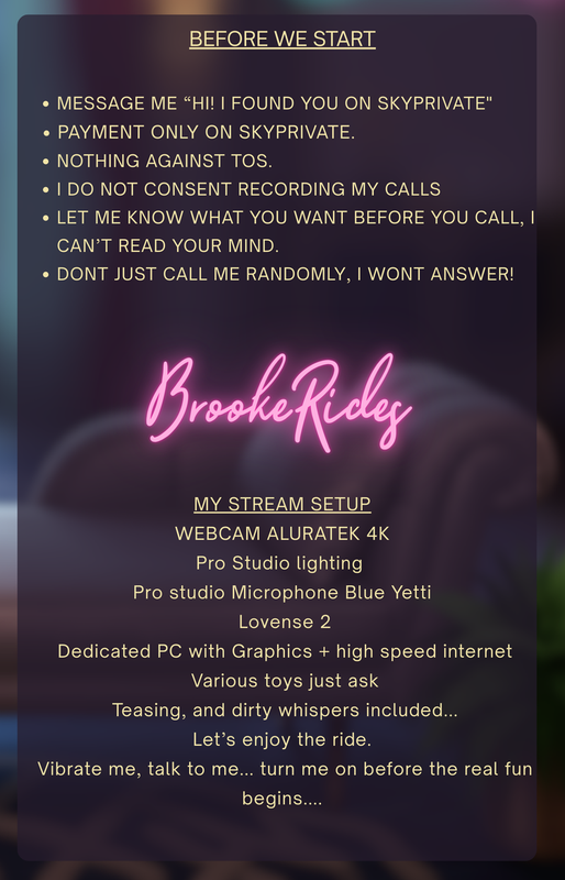 AÚN NO, Regístrate gratisNecesitas AÑADIR FONDOS a tu cuenta para que puedas llamar BrookeRides o cualquier otro modelo. Este es un sistema seguro que te permite pagar por shows privados de Skype por PAGO POR MINUTO.