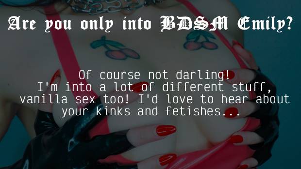 Puoi RICHIEDERE UN APPUNTAMENTO con Emily Doomed quando ti è più comodo. Tutto è impostato sul tuo fuso orario e sulle tue ore locali. Lei riceverà la tua richiesta e la accetterà se la sua agenda è libera. Riceverai una conferma via email e potrai prepararti per la tua esperienza piccante.